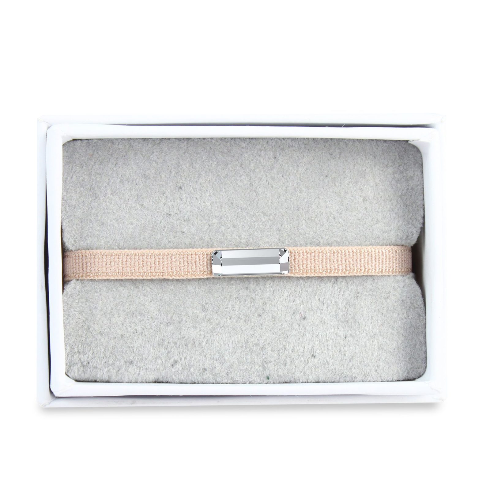 Composé d’un cristal rectangulaire biseauté et d’un ruban en satin stretch. S’ajuste à tous les poignets et résiste à l’eau. Ruban : 4 cm.