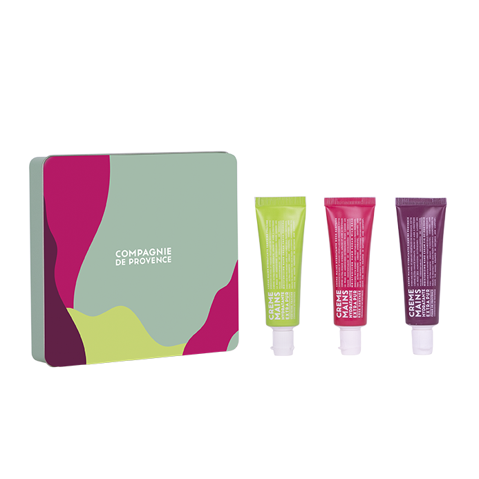 A offrir ou simplement pour se faire plaisir, c coffret en métal fait son entrée dans la collection de La Compagnie de Provence avec trois irrésistibles crèmes mains format voyage.