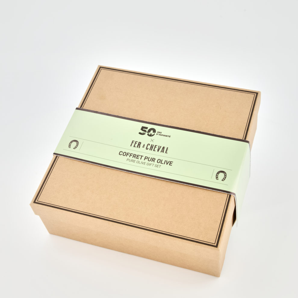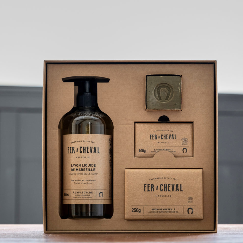 Dans ce coffret pure olive, le savon de Marseille se décline sous toutes ses formes. Fabriqués en chaudron à partir d’huiles végétales par la savonnerie Fer à Cheval, une institution depuis 1856, ils sont sans colorant, sans conservateur mais pas sans douceur.
