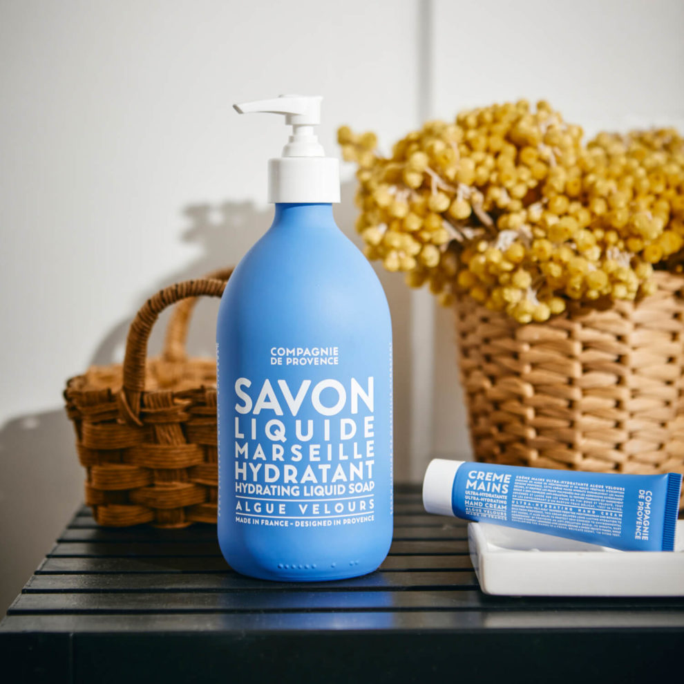 Un pochon en coton bio contenant un savon liquide de Marseille Algue Velours et une crème pour les mains Algue Velours. Le duo idéal pour bien hydrater toute la famille !