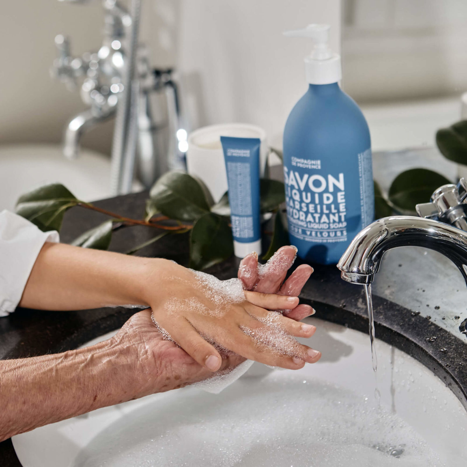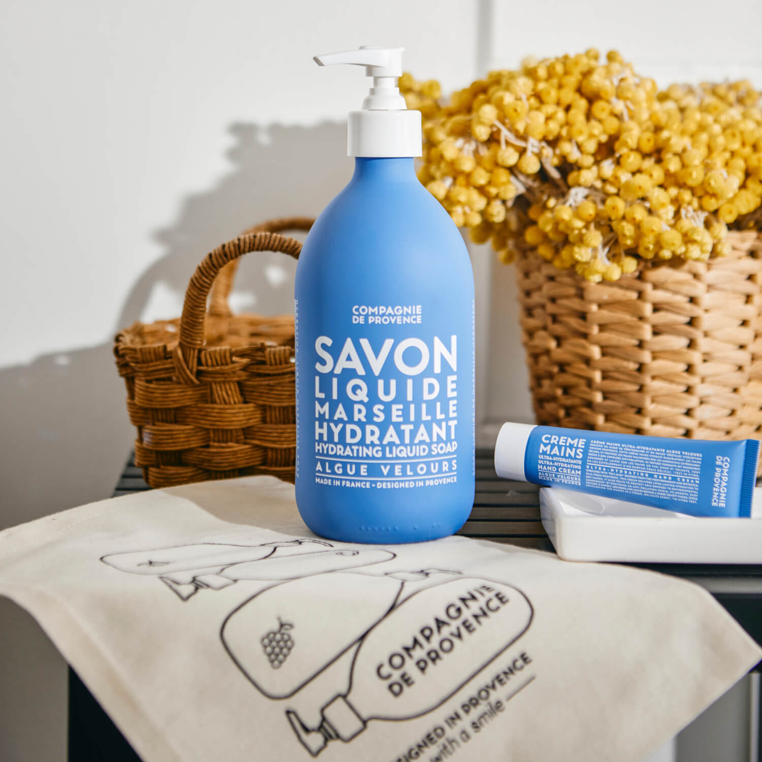Un pochon en coton bio contenant un savon liquide de Marseille Algue Velours et une crème pour les mains Algue Velours. Le duo idéal pour bien hydrater toute la famille !