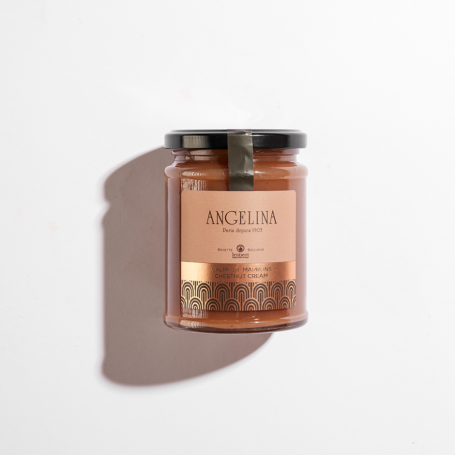 Produit phare de la maison Angelina et de son fameux « Mont-Blanc », cette crème de marron est de fabrication française et artisanale. Sucrée et gourmande avec une pointe de vanille, elle est préparée à partir de 50 g de purée de marrons pour 100 g de produit fini.