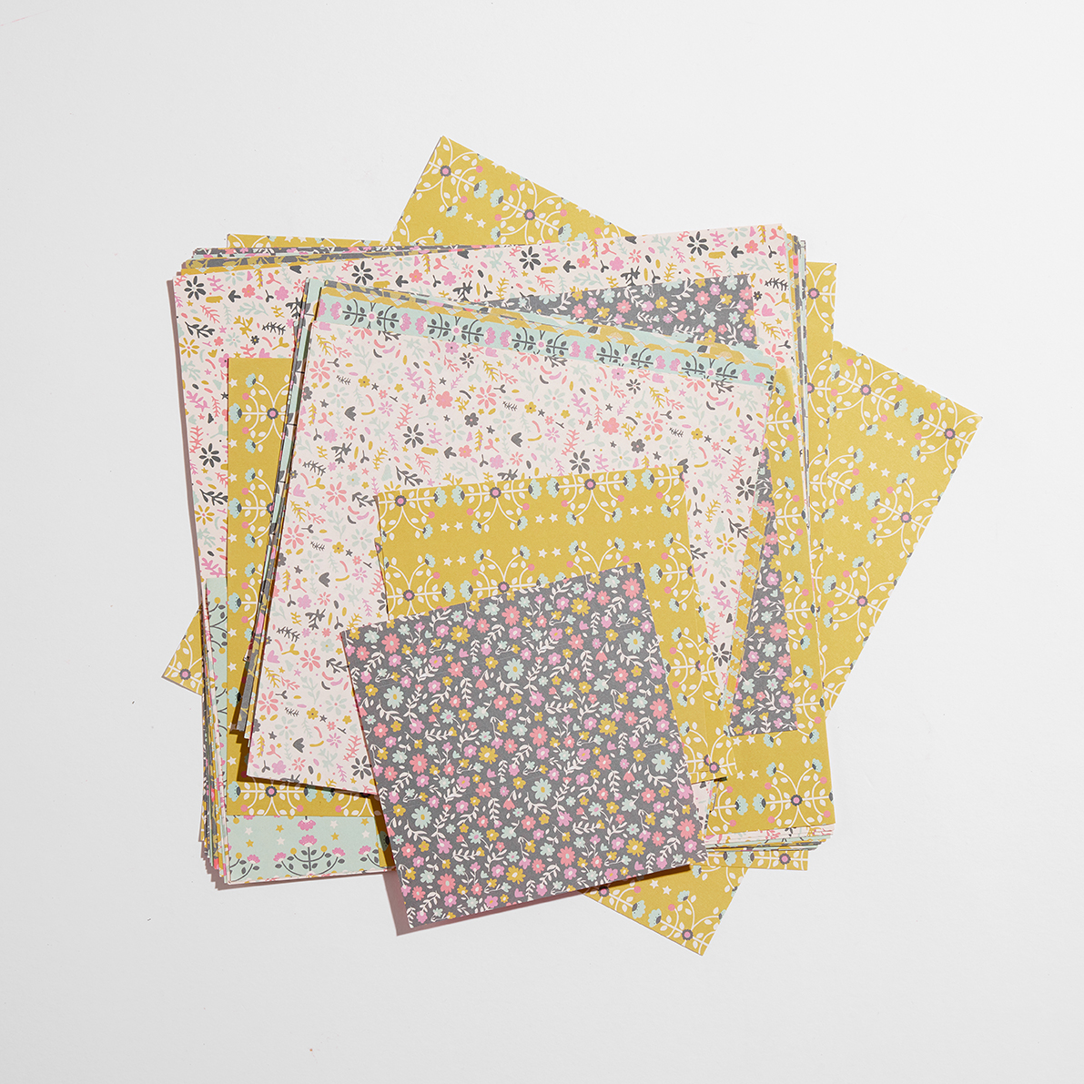 Cette pochette contient un assortiment de 60 feuilles imprimées au recto et unies au verso sur un papier de 70g/m2. Les feuilles sont coupées dans 3 formats différents : 20 feuilles au format 10x10cm, 20 feuilles au format 15x15cm et 20 feuilles au format 20x20cm. Les 10 motifs sont répétés 2 fois par format.