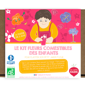 Le kit fleurs comestibles contient 5 variétés de graines de fleurs comestibles bio, pour insuffler de la couleur dans le potager de votre enfant ! Il lui permettra de semer ses premières fleurs, d’en prendre soin et de les déguster en famille.