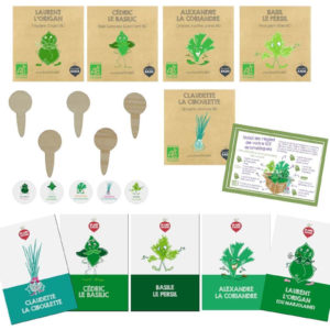 Ce kit contient 5 sortes d’aromates bio (du basilic, de la ciboulette, de l’origan, du persil et de la coriandre), 5 fiches pédagogiques illustrées, 5 pics en bois à semer et 5 autocollants illustrés à coller sur les pics.