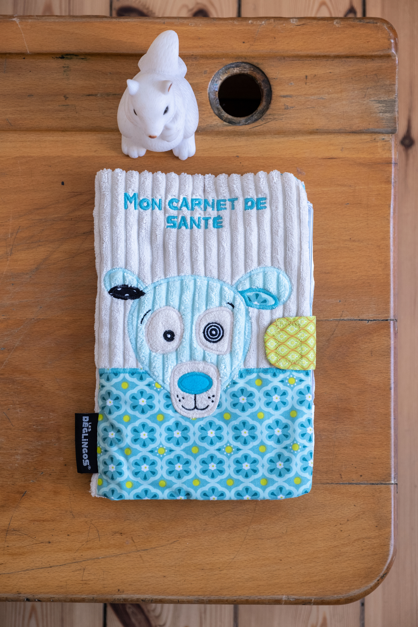 À force d’être manipulé, un carnet de santé peut s’abîmer. Pour le protéger, voici un protège carnet de l’ours Illicos, un des personnages emblématiques des Déglingos. Pratique, il viendra envelopper le carnet de santé et pourra également protéger les ordonnances et papiers précieux. Ludique, son patchwork coloré et ses matières étonnantes au toucher occupent bébé durant les consultations.