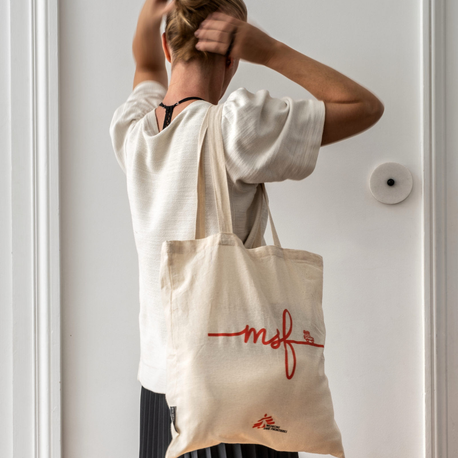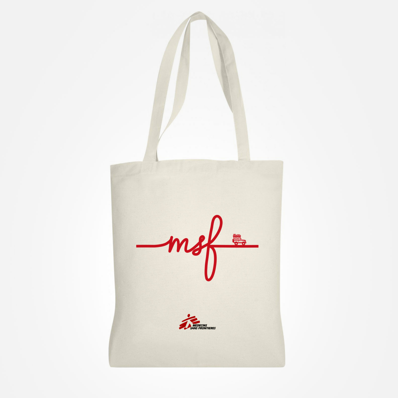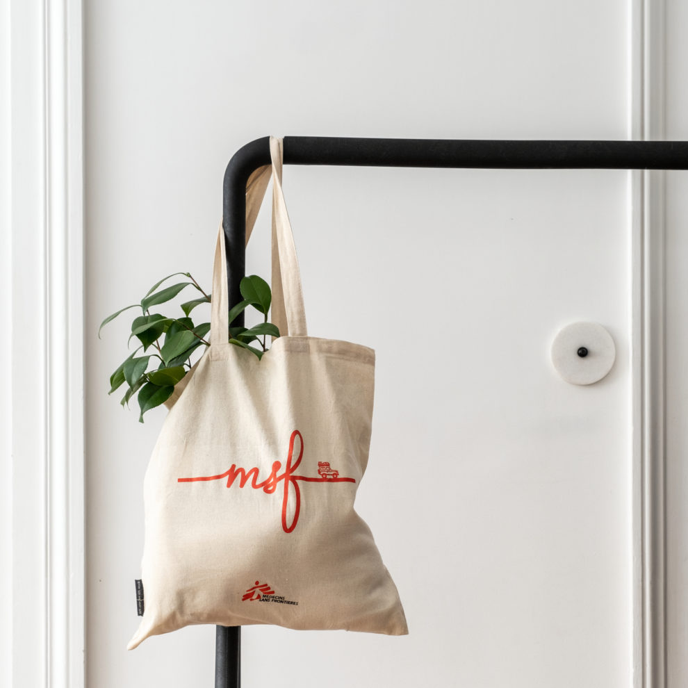 Sur le devant du sac sont sérigraphiés en rouge les lettres “msf” et le dessin d’une jeep, emblème de nos missions sur le terrain. En arborant fièrement ce tote bag, vous affichez ainsi votre soutien à notre association.