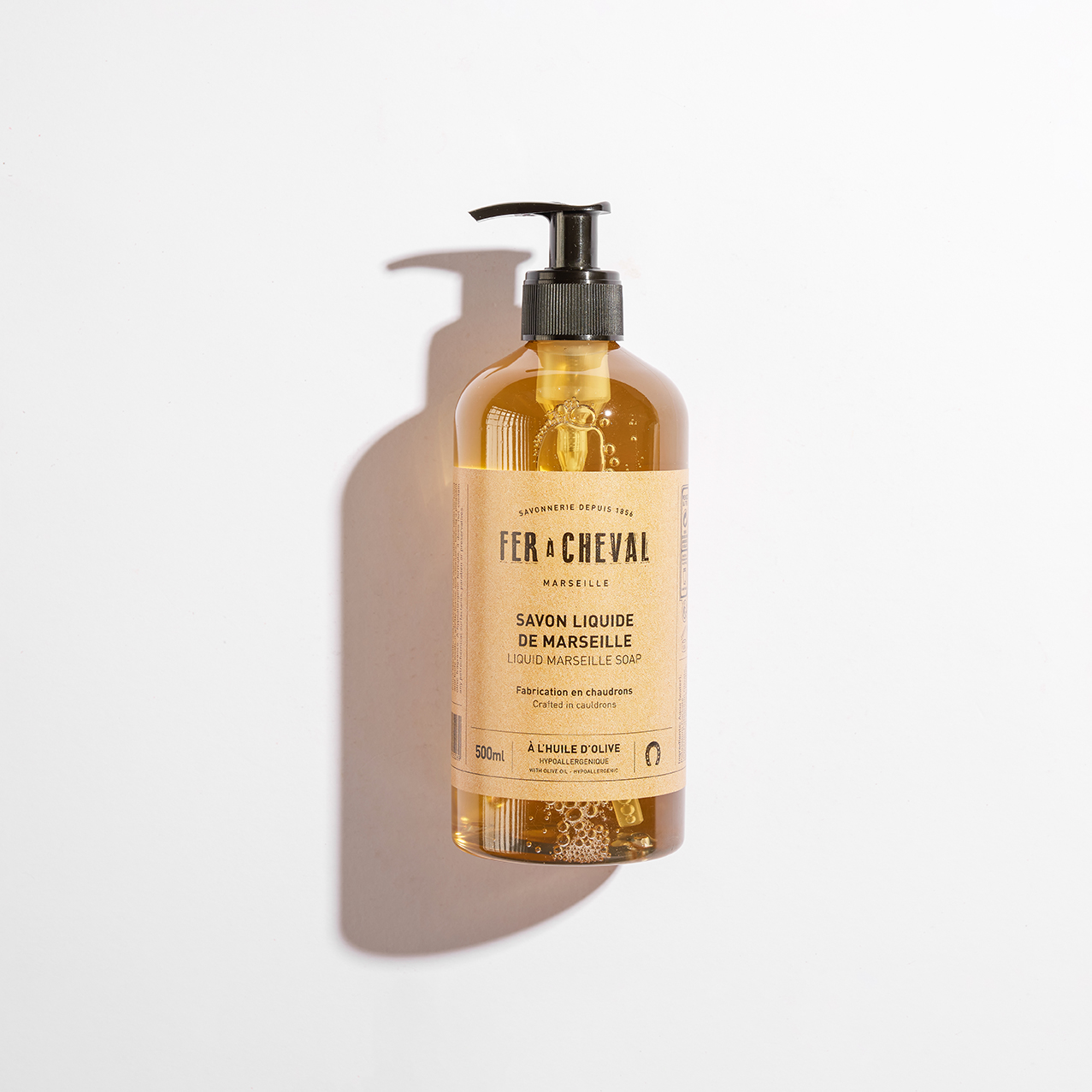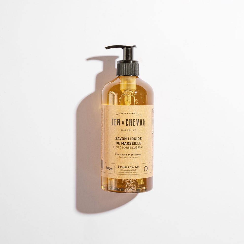 Le Savon liquide de Marseille à l’huile d’Olive 500ml de la savonnerie Fer à Cheval est idéal pour la toilette des mains et du corps.
